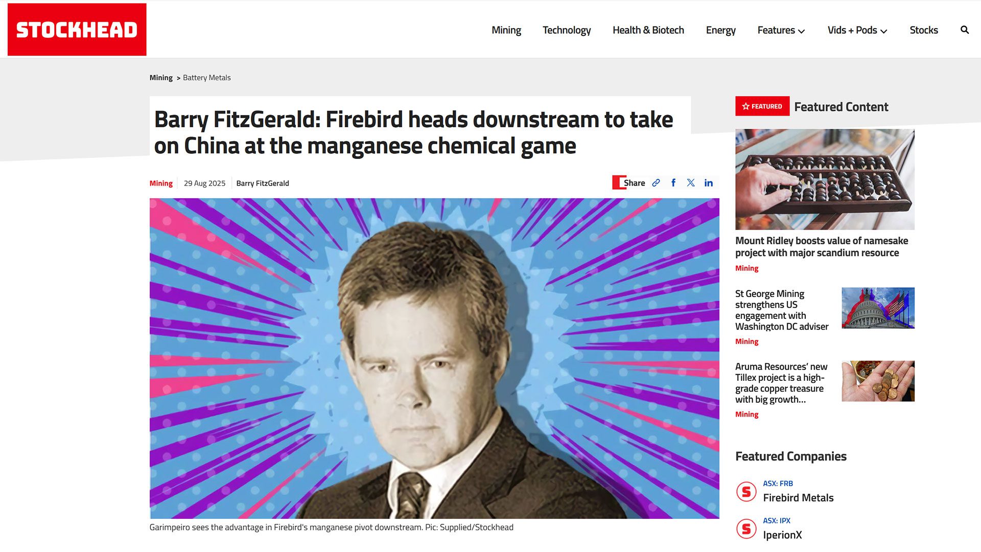 Read MoreStockhead – Barry FitzGerald: Firebird heads downstream to take on China at the manganese chemical game